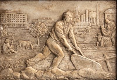 Piatto circolare con decorazione a rilievo di uomo a cavallo