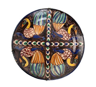 Piatto circolare con decorazione di cavallo a disegni geometrici