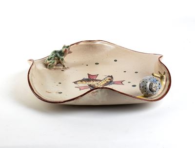 Piatto concavo con decorazione di pesci e rilievo di lumaca e rana, Cava dei Tirreni