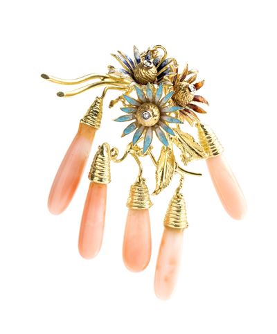 Pendente in oro con corallo, zaffiro e diamanti