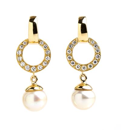 Paio di orecchini pendenti in oro con diamanti e perle