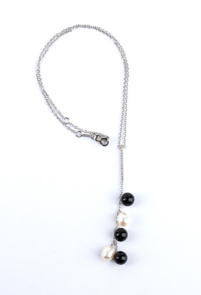 Girocollo in oro con barretta in diamanti, frangia in onice e perle di fiume.