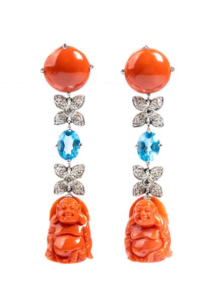 Orecchini pendenti in oro, corallo cerasuolo, topazio e diamanti