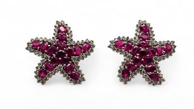 Paio di orecchini a fiore in corallo rosa e diamanti