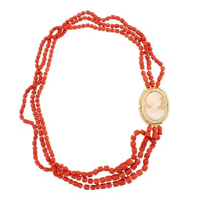 Collana a tre fili di corallo mediterraneo a barilotti sfaccettati