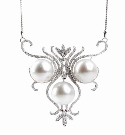 Girocollo E Pendente-Spilla In Oro Con Diamanti E Perline