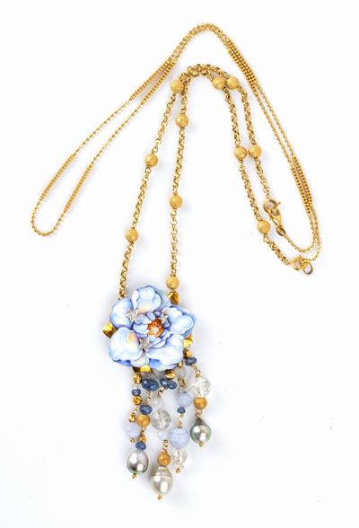 Collana Con Pendente - Spilla A Fiore In Oro Con Smalti E Diamanti