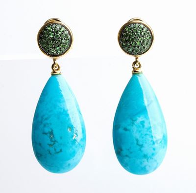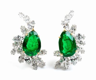 Paio DI Orecchini In Oro, Smalto, Diamanti E Smeraldi