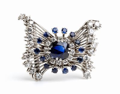Spilla In Oro, Motivo A Farfalla Con Zaffiri E Diamanti