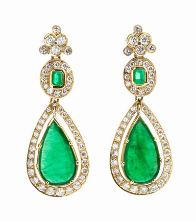 Paio DI Orecchini Pendenti In Oro Giallo Con Smeraldi E Diamanti