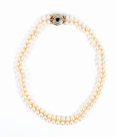 Collana A 2 Fili DI Perle, Fermezza In Oro Zaffiro E Brillanti