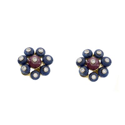 Orecchini Fiore A Lobo In Oro Giallo 18 Kt Zaffiri E Rubini