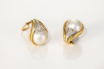 Orecchini A Clips In Oro Giallo E Bianco Con Perle Mabè E Piccoli Diamanti