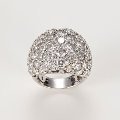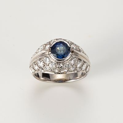 Anello A Cupola Ovale E Traforata In Oro Bianco Con Zaffiro E Diamanti