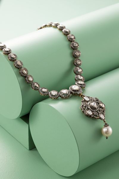 Antica Collana Girocollo In Oro E Argento Con Diamanti Vecchio Taglio