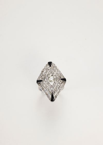 Anello A Losanga Traforata In Oro Bianco Con Diamanti E Onici