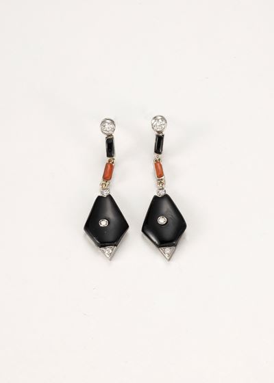 Orecchini Pendenti In Oro Bianco Con Onice, Corallo E Diamanti