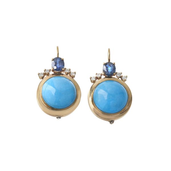 PAIO DI ORECCHINI PENDENTI CON PASTA DI TURCHESE ZAFFIRI E DIAMANTI