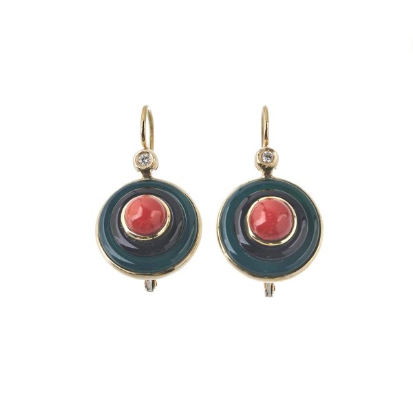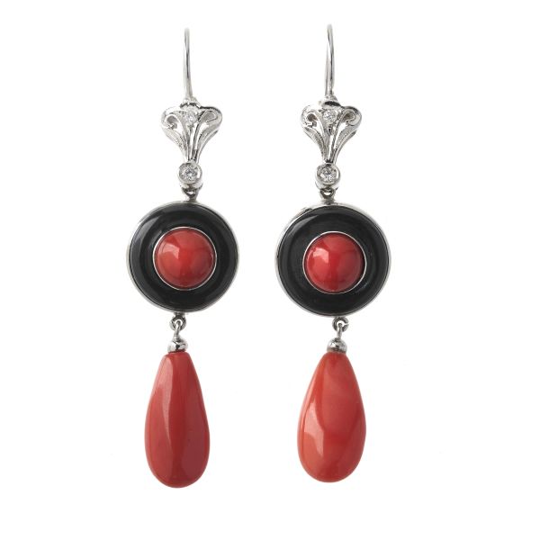 PAIO DI LUNGHI ORECCHINI PENDENTI CON CORALLO ONICE E DIAMANTI