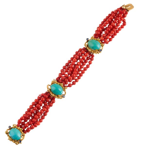 BRACCIALE A FASCIA MULTIFILO CON CORALLI E TURCHESI