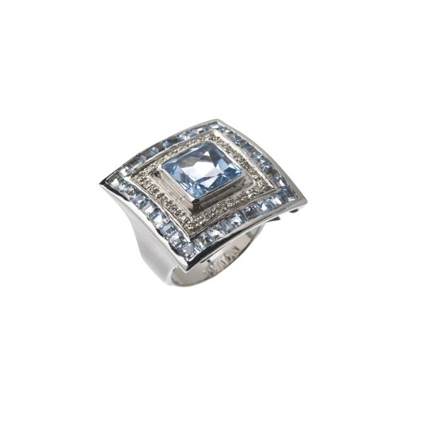 ANELLO GEOMETRICO CON ACQUAMARINE E DIAMANTI