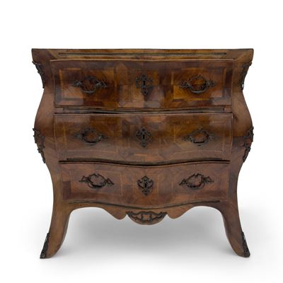 Commode di forma bombata lastronata e filettata in noce, Sicilia, XVIII secolo