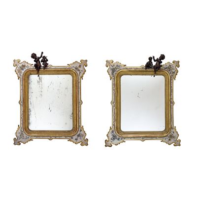 Coppia di specchiere in legno laccato grigio e dorato, Sicilia, XIX secolo