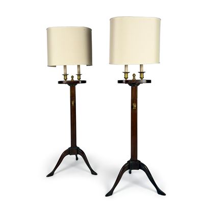 Coppia di lumi da terra in mogano a due luci ciascuno