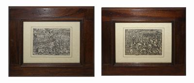 Coppia di incisioni raffiguranti scene belliche