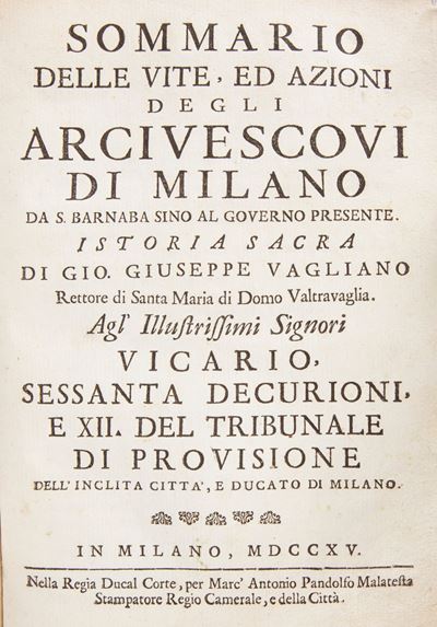 Giovanni Giuseppe Vagliano - Sommario Delle Vite, Ed Azioni Degli Arcivescovi DI Milano Da S. Bar...