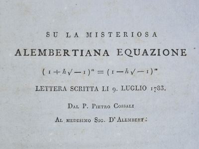 Cossali, Pietro: SU LA MISTERIOSA ALEMBERTIANA EQUAZIONE (1+hv-1)m=(1-hv-1)m LETTERA SCRITTA LI 9...