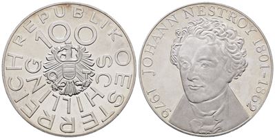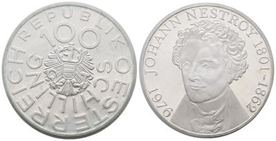 AUSTRIA. 100 Scellini 1976 "Johann Nestroy". KM 2932; Ag; 24 Gr