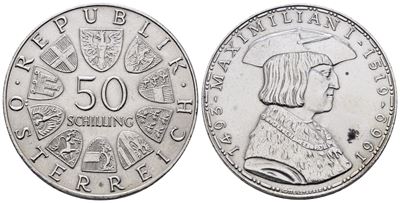 AUSTRIA. 50 Scellini 1969 "450 Anni Dalla Morte DI Massimiliano I". KM 2906; Ag; 20 Gr