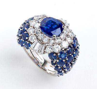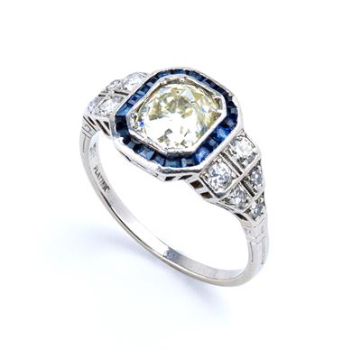 Anello Art DéCo In Platino Con Diamante E Zaffiri