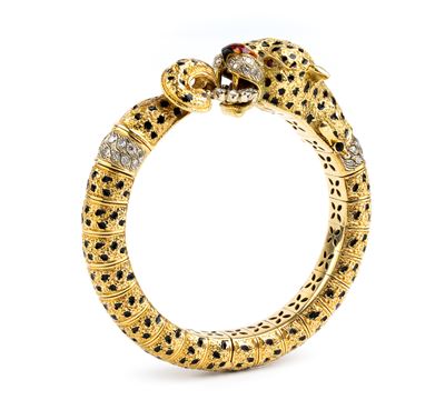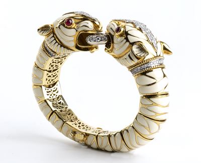 Bracciale Flessibile In Oro Con Coppia DI Teste DI Tigre, Smalto Bianco, Rubini E Diamanti