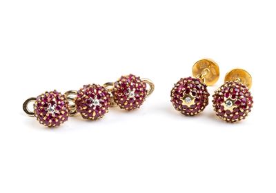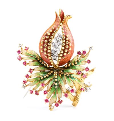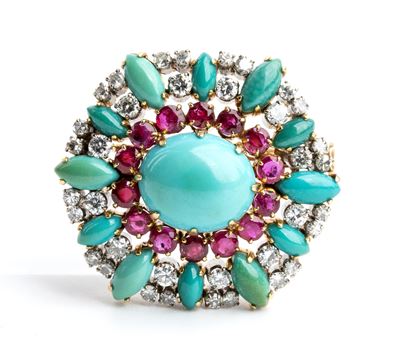 Spilla In Oro Con Turchesi, Rubini E Diamanti