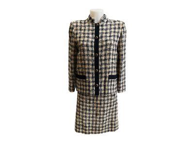 Tailleur sartoriale in tweed bouclé bianco e blu