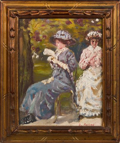 Autore ignoto, Signore al parco, olio su tela applicata su compensato