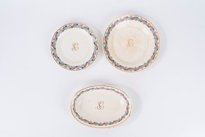 Migliuolo Giustiniani, Set di piatti e vassoio ovale in terraglia decorata, Napoli, secondo decen...
