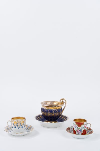 Lotto di tre tazze in porcellana policroma con piattino, secolo XIX