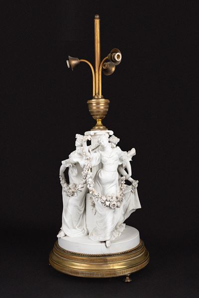 Lampada da tavolo in biscuit e bronzo dorato con fusto a tre fanciulle danzanti, inizi secolo XX