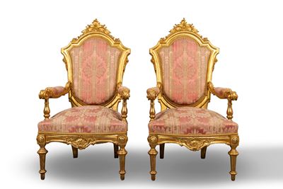 Coppia di poltrone in legno intagliato e dorato, secolo XIX, con tappezzeria rosa