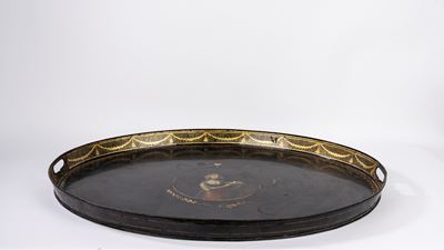 Vassoio laccato nero, decorato con figura di giovane donna e colombe, secolo XIX