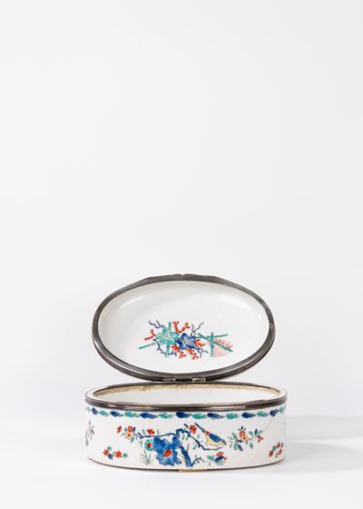 Scatola in porcellana bianca decorata a chinoiserie con bordo in argento