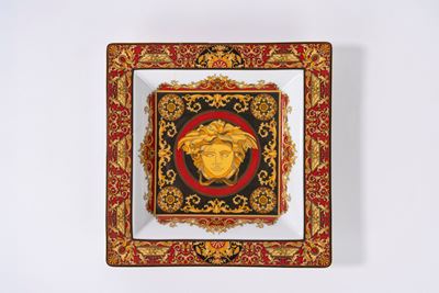 Versace per Rosenthal, Piatto quadrato in porcellana policroma con decorazione a medusa