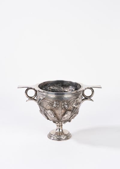 Coppa biansata Liberty in metallo argentato, decorata con foglie d'edera