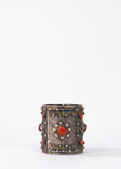 Grande bracciale berbero, Cabilia, Algeria, metallo argentato, corallo e smalti policromi, inizio...