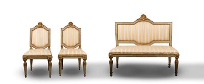Salottino piemontese, divanetto e coppia di sedie, legno laccato grigio con profili dorati, fine ...
