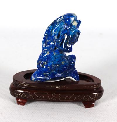 Statuina cinese in lapislazzuli con basetta in teak, 'Drago'
