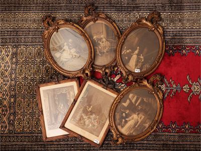 Raccolta di sei stampe, circa cm 23x17, in cornice